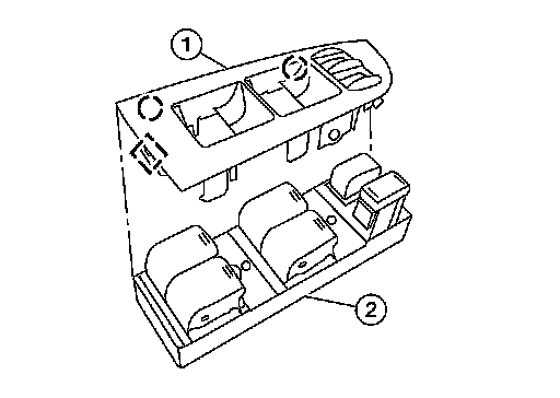 5.Release the pawls on each side to separate the switch finisher (1) from the main power window and door lock/unlock switch (2).