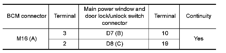 and 3 and main power window and door lock/unlock switch connectors D7 (B) terminal 10 and D8 (C) terminal 19.