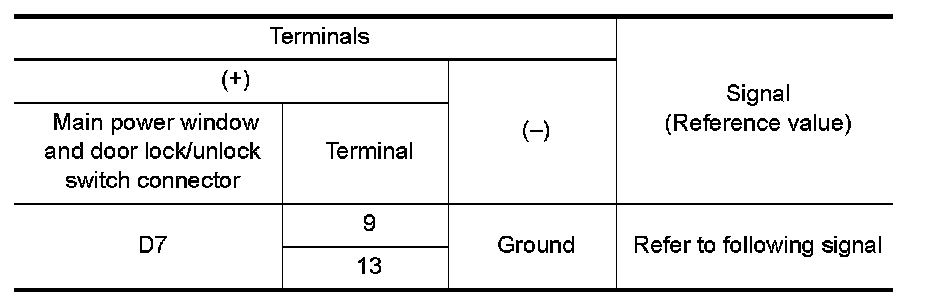 2.Check signal between main power window and door lock/unlock switch connector D7 terminals 9, 13 and ground with oscilloscope.