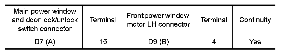 unlock switch connector D7 (A) terminal 15 and front power window motor LH connector D9 (B) terminal 4.