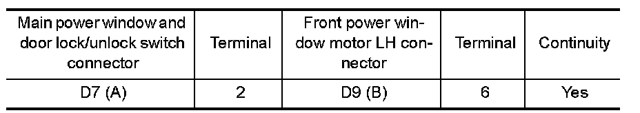 unlock switch connector D7 (A) terminal 2 and front power window motor LH connector D9 (B) terminal 6.