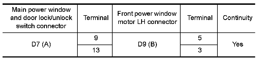 unlock switch connector D7 (A) terminals 9, 13 and front power window motor LH connector D9 (B) terminals 3, 5.