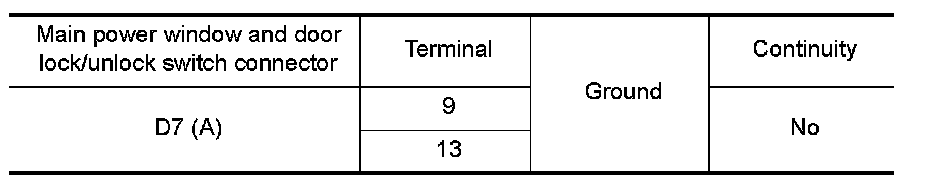 3.Check continuity between main power window and door lock/unlock switch connector D7 (A) terminals 9, 13 and ground.