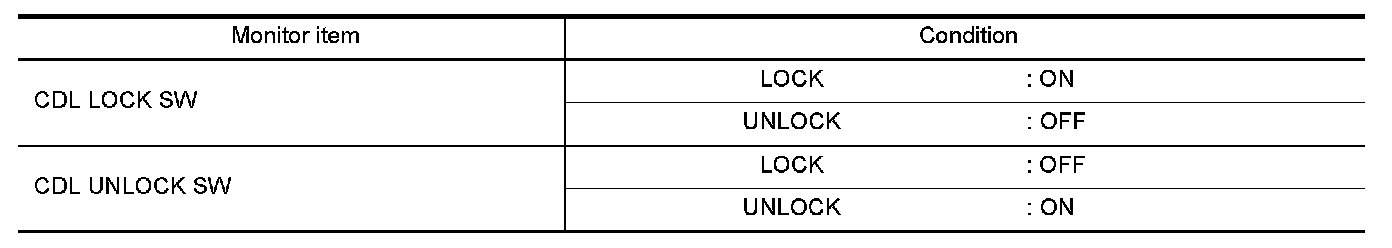 Check ("CDL LOCK SW ", "CDL UNLOCK SW") in "DATA MONITOR" mode for "POWER DOOR LOCK SYSTEM" with CONSULT. Door Lock.