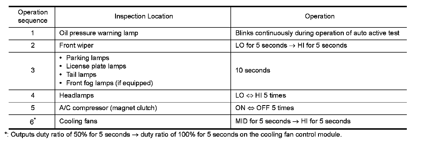 In auto active test mode, the IPDM E/R sends a drive signal to the following systems to check their operation.
