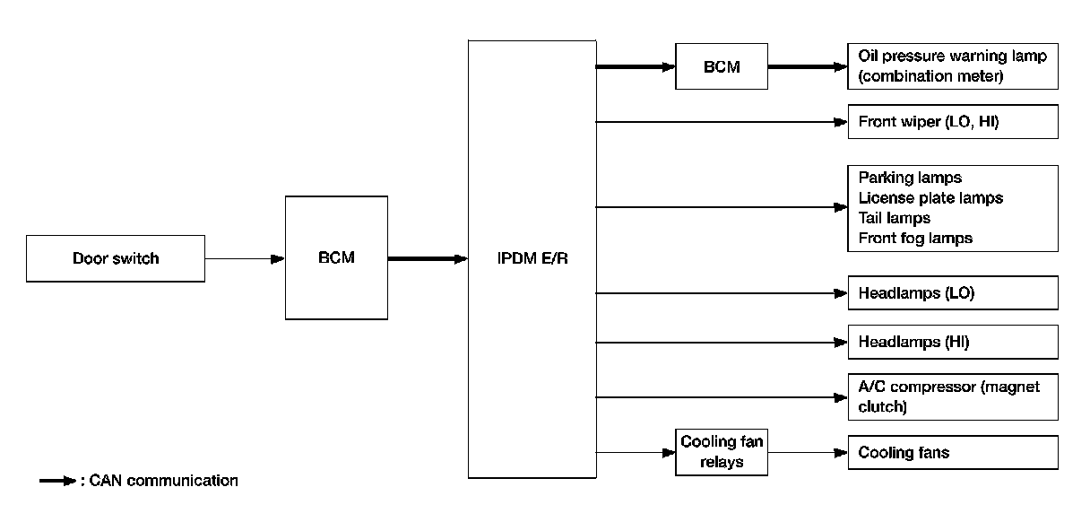 - IPDM E/R starts the auto active test with the door switch signals transmitted by BCM via CAN communication. Therefore, the CAN communication line between IPDM E/R and BCM is considered normal if the auto active test starts successfully.