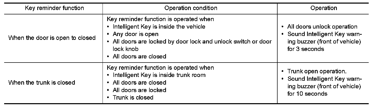 - Intelligent Key unit sends the door lock/unlock signal and sounds Intelligent Key warning buzzer (front of vehicle) warning (lock: 2 times, unlock: 1 time, trunk open: 4 times) at the same time.