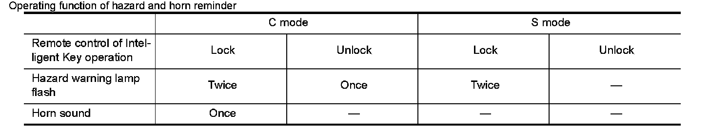 The hazard and buzzer reminder has a horn chirp mode (C mode) and a non-horn chirp mode (S mode).