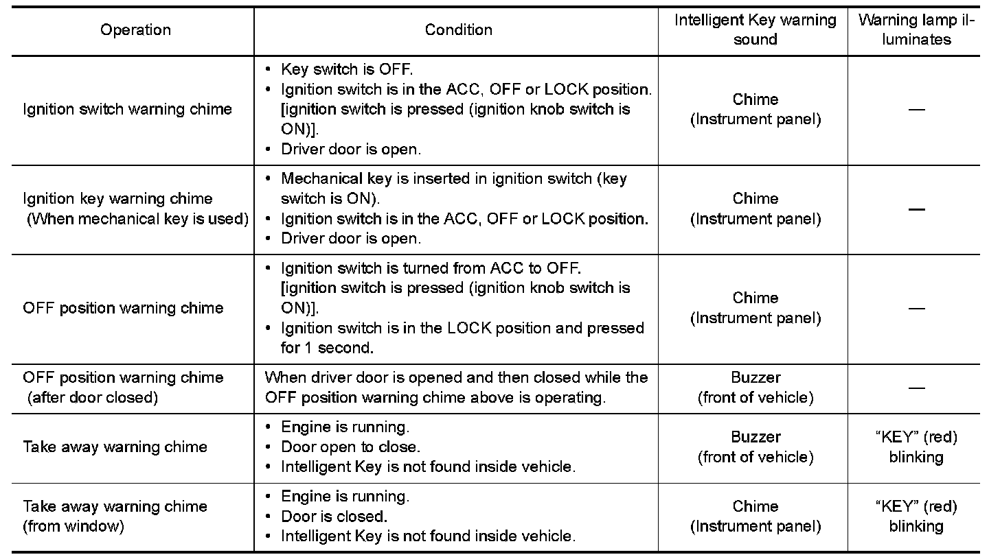 The following warning chime (combination meter), Intelligent Key warning buzzer (front of vehicle), and warning lamps "KEY" and "P-SHIFT" (combination meter) are given to the user as warning information while using the Intelligent Key system.