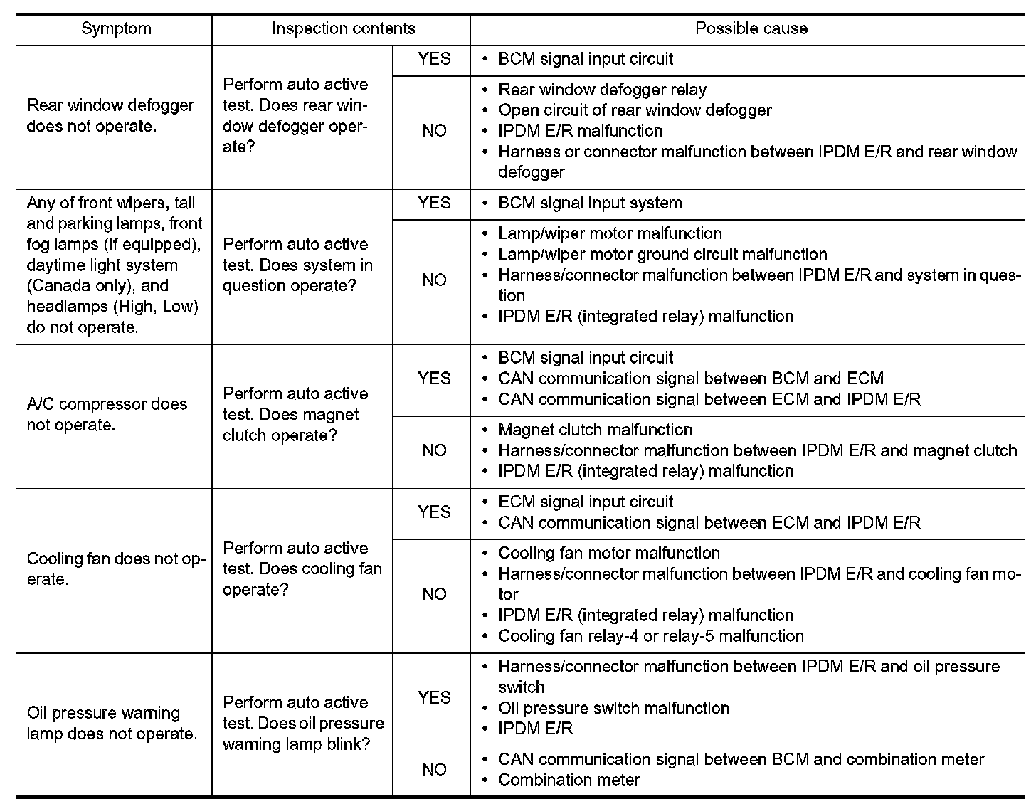 - If any of the systems controlled by IPDM E/R cannot be operated, possible cause can be easily diagnosed using auto active test.