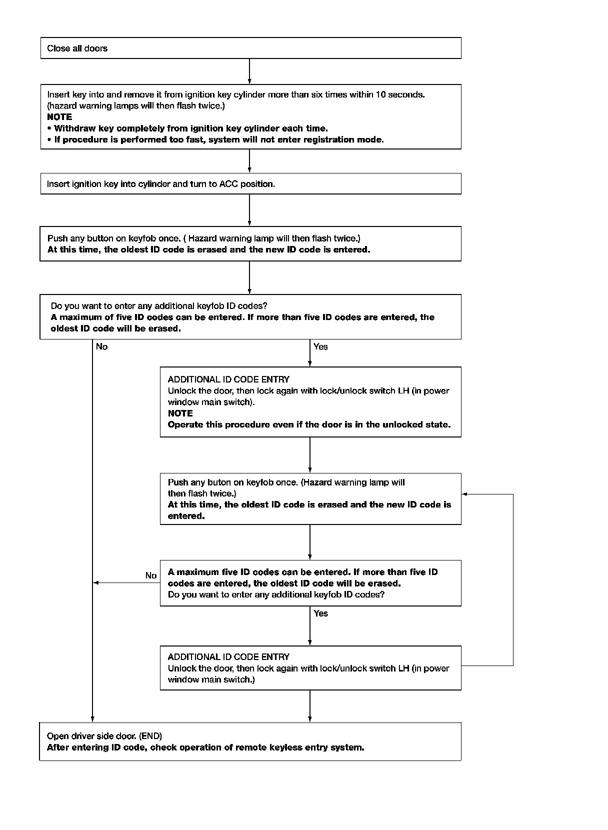 -When registering an additional keyfob, the existing ID codes in memory may or may not be erased. If five ID codes are stored in memory, when an additional code is registered, only the oldest code is erased. If less than five ID codes are stored in memory, when an additional ID code is registered, the new ID code is added and no ID codes are erased.