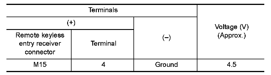 2.Check voltage between remote keyless entry receiver connector M15 terminal 4 and ground.