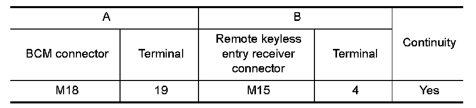 2.Check continuity between BCM connector M18 (A) terminal 19 and remote keyless entry receiver connector M15 (B) terminal 4.