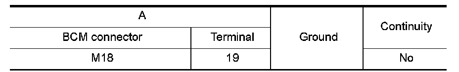 3.Check continuity between BCM connector (A) M18 terminal 19