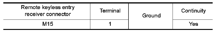 Check continuity between remote keyless entry receiver connector M15 terminal 1 and ground.