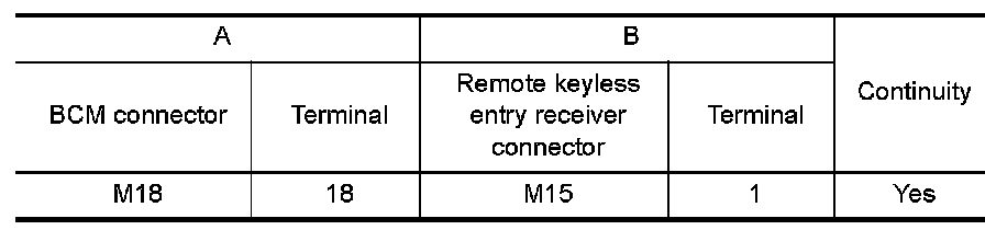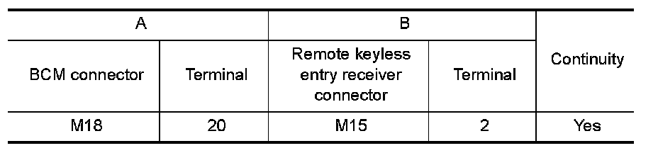 1.Check continuity between BCM connector M18 (A) terminal 20 and remote keyless entry receiver connector M15 (B) terminal 2.