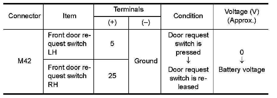2.Check voltage between front door request switch harness connector D4 (LH), D103 (RH) terminal 3 and ground.
