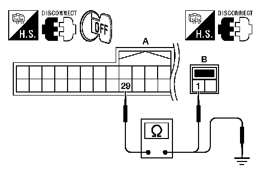 2.Check continuity between Intelligent Key unit harness connector M42 (A) terminal 29 and trunk opener request switch harness connector T5 (B) terminal 1.