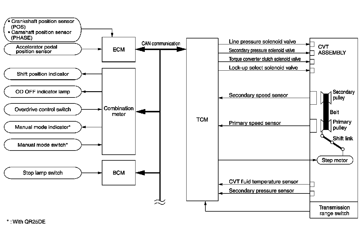 The CVT senses vehicle operating conditions through various sensors. It always controls the optimum shift position and reduces shifting and lock-up shocks.