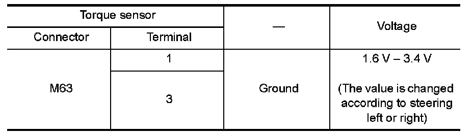 Check voltage between torque sensor harness connector terminal and ground while turning the steering wheel.