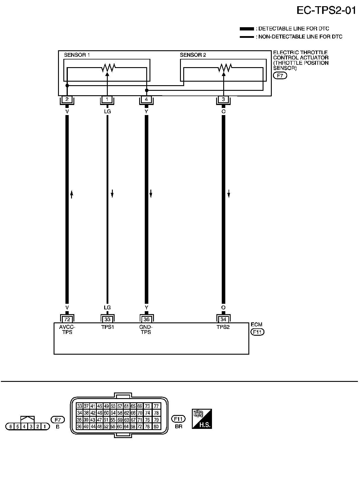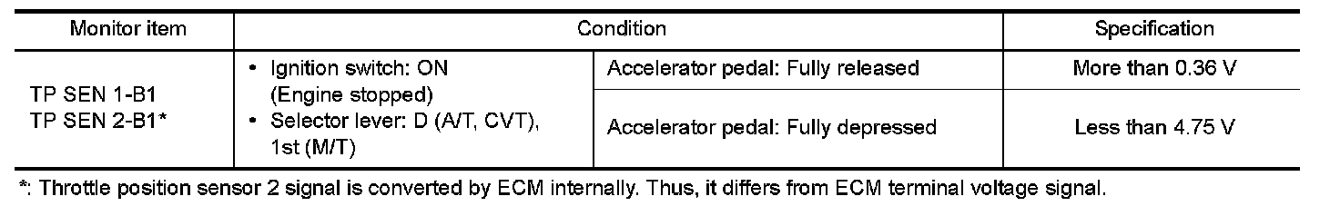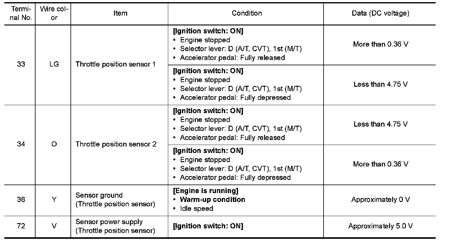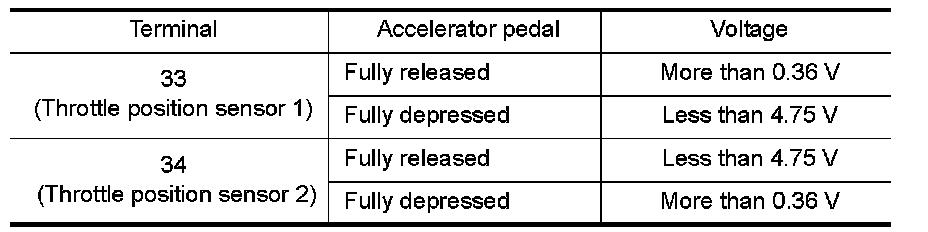 5.Check voltage between ECM terminals 33 (TP sensor 1 signal), 34 (TP sensor 2 signal) and ground under the following conditions.
