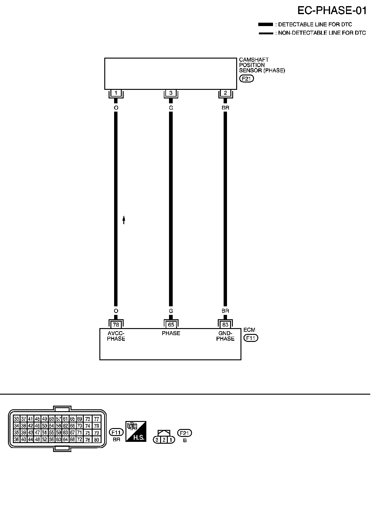 1.Check harness continuity between CMP sensor (PHASE) terminal 3 and ECM terminal 65.