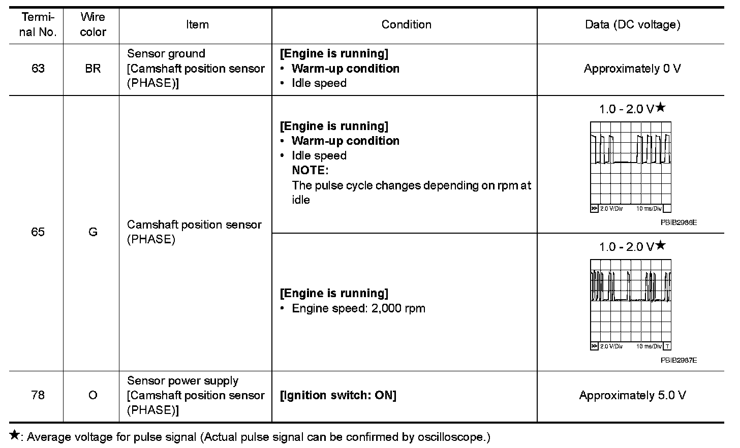 The camshaft position sensor (PHASE) senses the protrusion of camshaft (INT) to identify a particular cylinder. The camshaft position sensor (PHASE) senses the piston position. When the crankshaft position sensor (POS) system becomes inoperative, the camshaft position sensor (PHASE) provides various controls of engine parts instead, utilizing timing of cylinder identification signals. The sensor consists of a permanent magnet and Hall IC. When engine is running, the high and low parts of the teeth cause the gap with the sensor to change. The changing gap causes the magnetic field near the sensor to change. Due to the changing magnetic field, the voltage from the sensor changes.