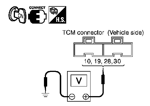 - Harness for short or open between ignition switch and TCM connector terminal 10, 19
