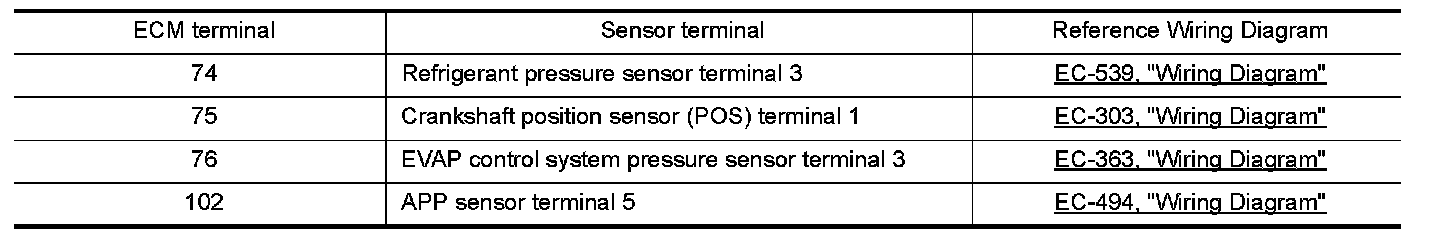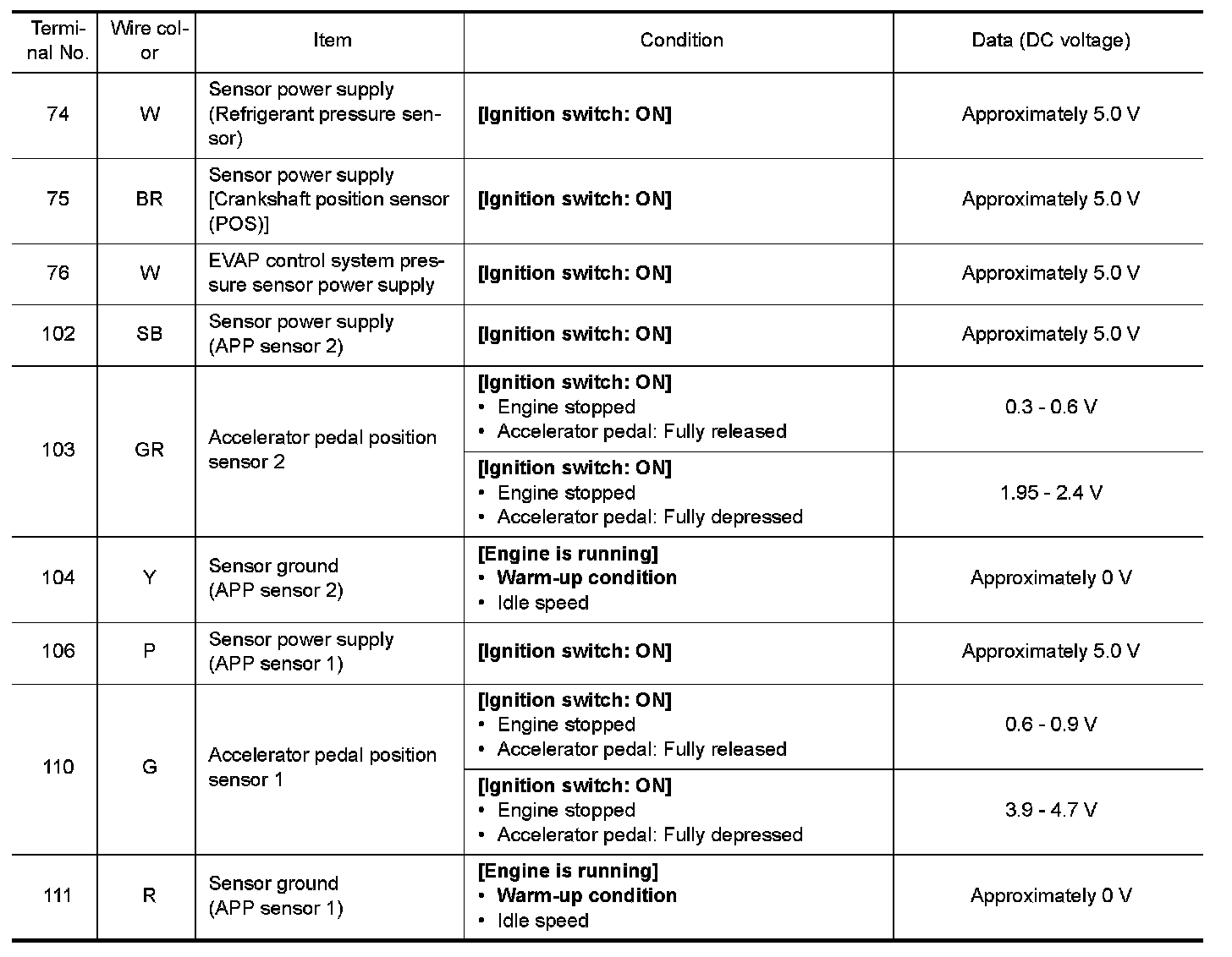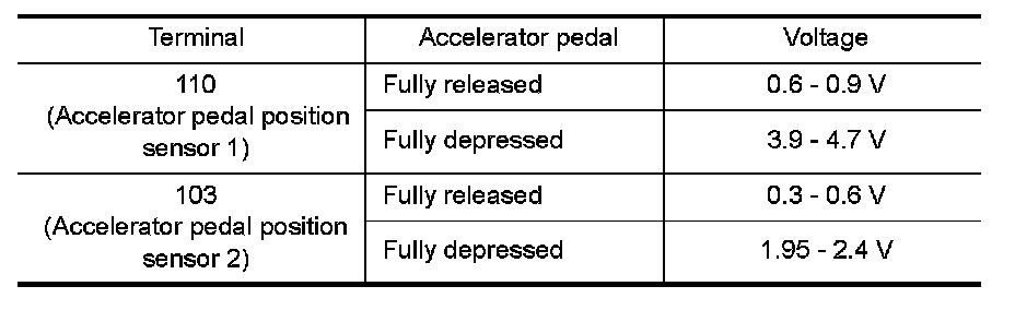 3.Check voltage between ECM terminals 110 (APP sensor 1 signal), 103 (APP sensor 2 signal) and ground under the following conditions.