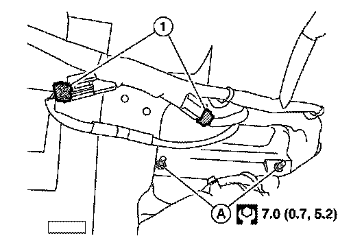 2.Disconnect the harness connectors (1), remove the nuts and the back door handle (A).