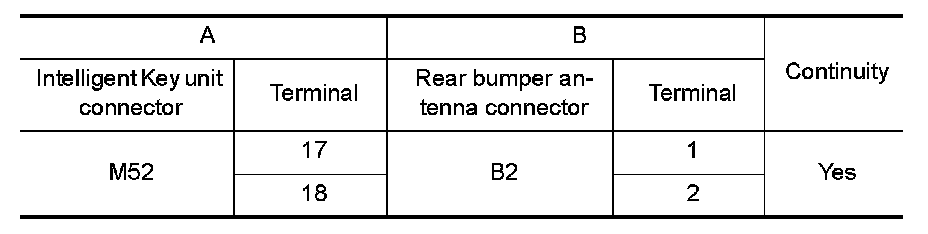 2.Check continuity between Intelligent Key unit connector and rear bumper antenna connector.