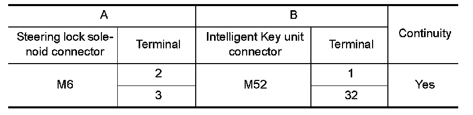 2.Check continuity between steering lock solenoid and Intelligent Key unit.