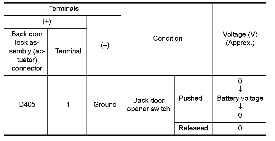 4.Check voltage between back door lock assembly (actuator) connector D405 terminal 1 and ground.