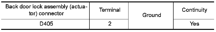 Check continuity between back door lock assembly (actuator) connector D405 terminal 2 and ground.