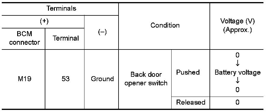 2.Check voltage between BCM connector M19 terminal 53 and ground.
