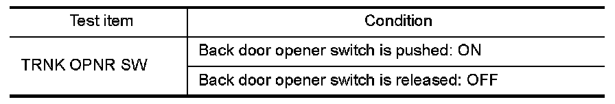 Check back door opener switch ("TRNK OPNR SW") in "DATA MONITOR" mode with CONSULT.