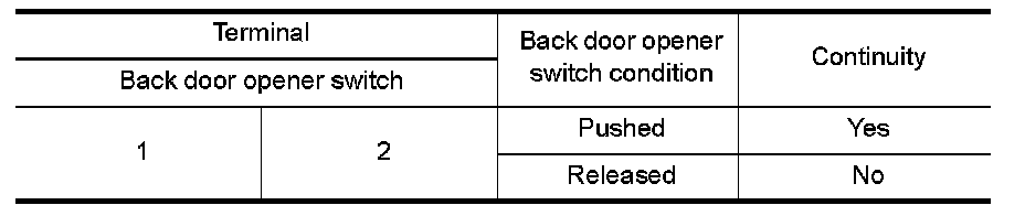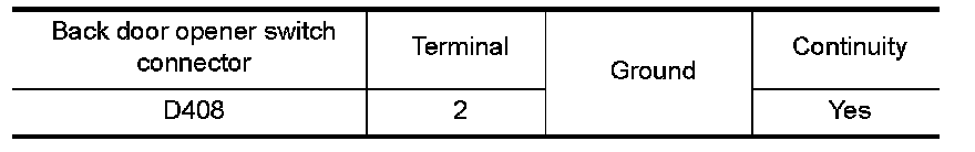 Check continuity between back door opener switch connector terminal 2 and ground.