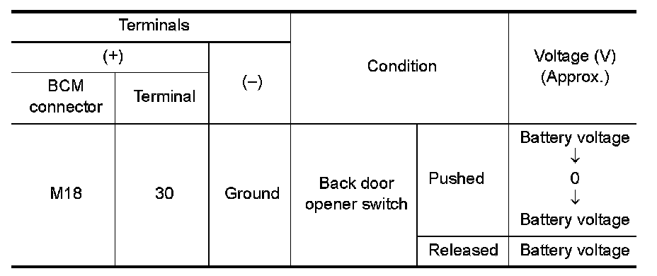 2.Check voltage between BCM connector M18 terminal 30 and ground.