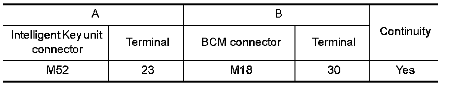 1.Disconnect Intelligent Key unit connector M52 and BCM connector M18.