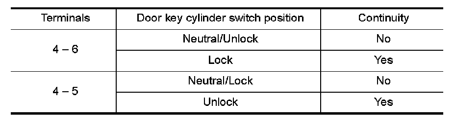 Check continuity between front door lock assembly LH (key cylinder switch) terminals.