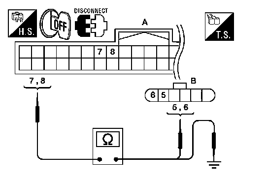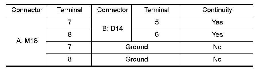 2.Check continuity between BCM connector (A) M18 terminals 7, 8 and front door lock assembly LH (key cylinder switch) connector (B) D14 terminals 5, 6 and body ground.