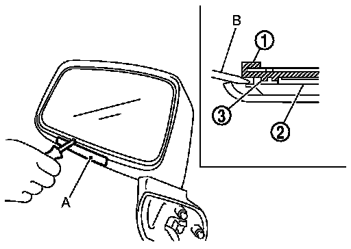 4.Insert suitable tool (B) into the concave gap between mirror holder (1) and power unit (2). Push up tabs (3) (2 locations) on mirror holder to disengage lower part of mirror holder, and remove mirror body assembly.