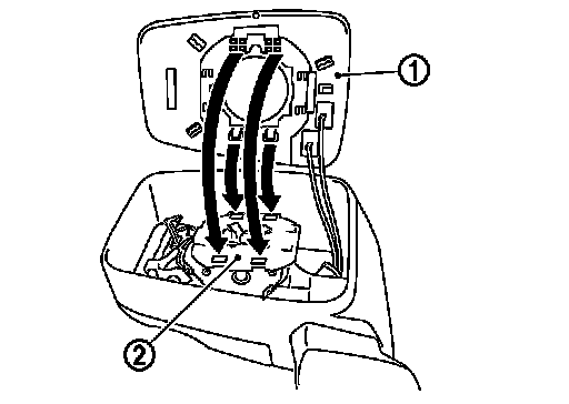 2.Engage upper tabs of mirror body (1) with power unit (2). Then, press lower part of mirror glass down until the lower part snaps to allow engagement of lower tabs.