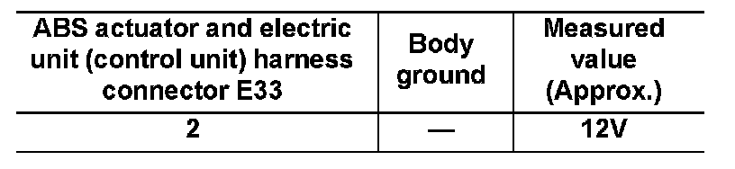 1.Check voltage between ABS actuator and electric unit (control unit) harness connector E33 and ground.