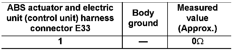 2.Check resistance between ABS actuator and electric unit (control unit) connector E33 and ground.