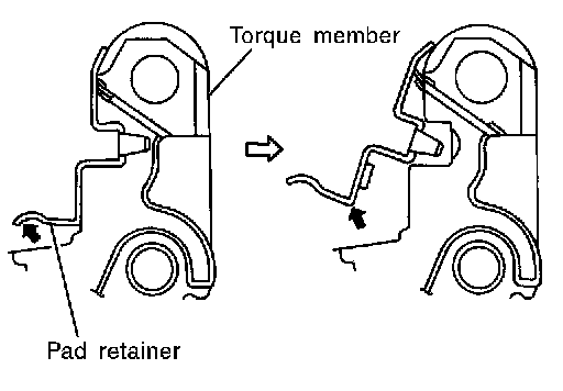 When removing pad retainer from torque member, lift the pad retainer in the direction shown by arrow, so as not to deform it.