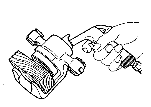 4.Place a wooden block as shown, and blow air from union bolt mounting hole to remove piston and piston boot.