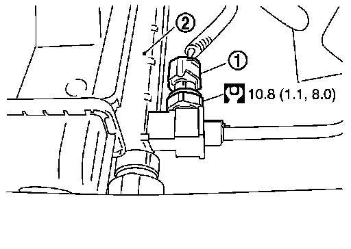 3.Disconnect the connector, and then remove the refrigerant pressure sensor (1) from condenser (2).