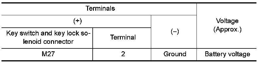 Check voltage between key switch and key lock solenoid harness connector and ground.