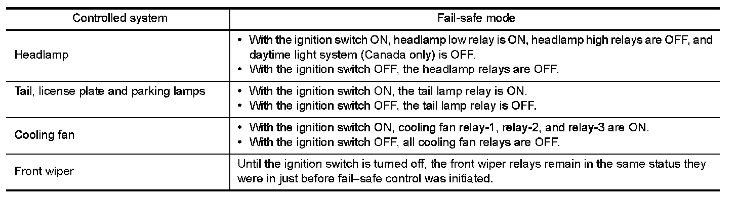 - Operation of control parts by IPDM E/R during fail-safe mode is as follows: